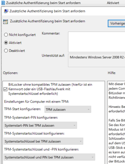 • gpedit.msc: Computer Konfiguration/Administrative Vorlagen/Windows-Komponenten/BitLocker-Laufwerkverschlüsselung/Betriebssystemlaufwerke